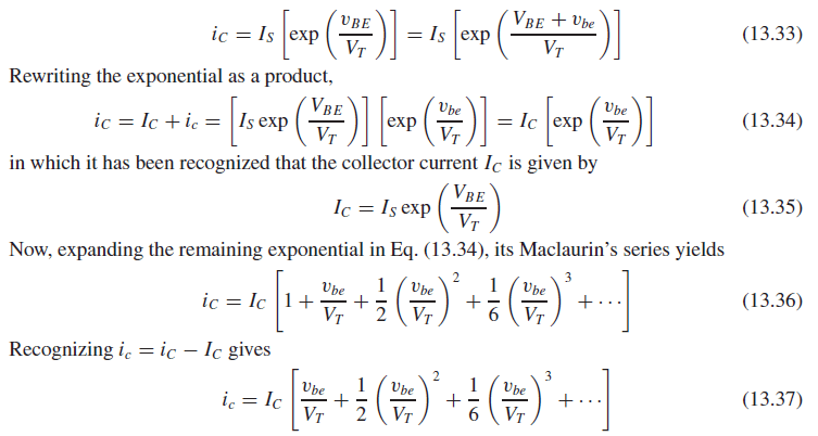 What comes next is very surprising and important! Have you ever noticed that for {g_m V_{be}} , which is {\frac{I_c} {V_t} V_{be}}, which is the small signal model for {i_{c}}, to be a viable model, your {V_{be}} would have to be sufficiently smaller than the thermal voltage at room temperature?? I didn’t, either! This is outstanding!